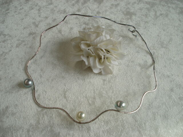 ワイヤーの波打つ感じとグレーバロックと白いアコヤがマッチして、とても個性的なネックレスへと